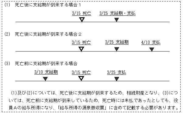 すなわち、死亡日後に支給期(賃金支払日)が到来する賃金は、死亡した従業員の「給与所得」ではなく、遺族が受け取る「相続財産」となり相続税の対象になります。例えば20日締め25日支払の会社で、従業員が3月15日に亡くなった場合、2月21日~3月15日までの3月分給与は3月25日が支給期(支払日)となり、死亡日後なので、相続人が受け取る相続財産となり、給与総額から所得税を控除する必要はありません(以下は、国税庁ホームページに掲載の参考図です)。
