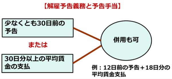 使用者が解雇を行う場合には、原則として30日以上前に予告を行うか、平均賃金の30日分以上の金員(これを予告手当と言います)を支払う、または、これらの併用を行うことが必要です。